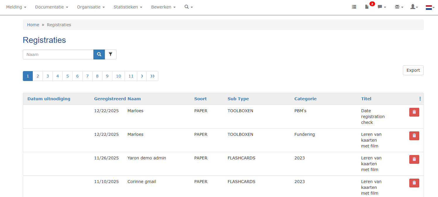 Voor een overzicht van alle geregistreerde toolboxen ga je naar Organisatie > Registraties. Gebruik de zoekbalk of filterfunctie om op specifieke toolbox of gebruiker te zoeken / filteren.